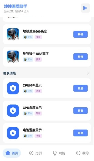 坤坤画质助手能为用户带来超广角的画质优化体验,同时具备游戏帧率增强功能,可稳定锁定120帧运行;软件丰富多样的实用功能,助力用户轻松享受更优质的游戏过程,并且兼容多个不同服务器的吃鸡游戏。