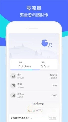 当新旧手机相互安装换机助手,新机选择零流量接收,旧机选择零流量转移,并挑选需转移的文件类型,轻松一念之间,几秒钟瞬间完成资料迁移,傻瓜式的简单操作,换机变得如此轻松无比!
