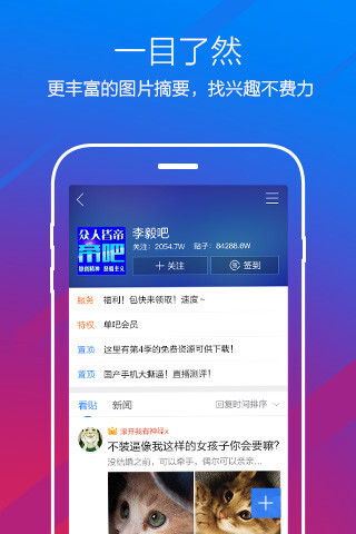 无论你是热衷追捧明星的粉丝,痴迷体育赛事的追星狂人,钟情动漫世界的爱好者,沉浸游戏天地的玩家,擅长发掘美食的达人,还是充满文艺气息的青年,贴吧都能充分满足你所有的兴趣,同时还会引领你结识那些有着共同爱好的朋友。