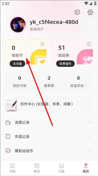 1、启动布咕阅读应用,登录账号后进入主界面,接着打开“我的”页面,在这里能够查看消费记录、充值记录、书架以及阅读历史等内容,随后点击页面左侧的“去充值”按钮即可。