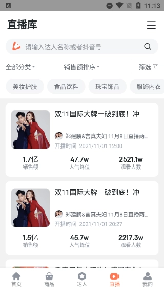 3、直播给用户提供到达人直播的销售额、人气以及观看人数等多重数据