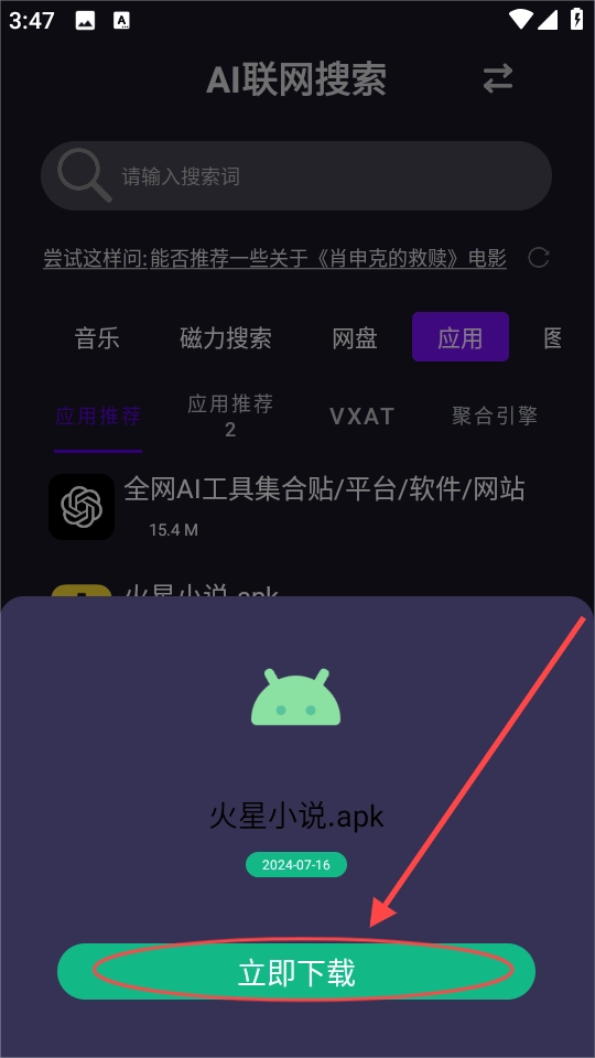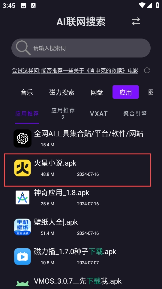 3、任意选择一个你需要的资源进行,这里小编选择的是应用栏目里面的“火星小说”。