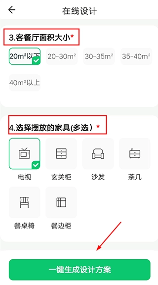 3、随后能够选择房间面积大小,需摆放的家具等,选择完成后,点击【一键生成设计方案】。