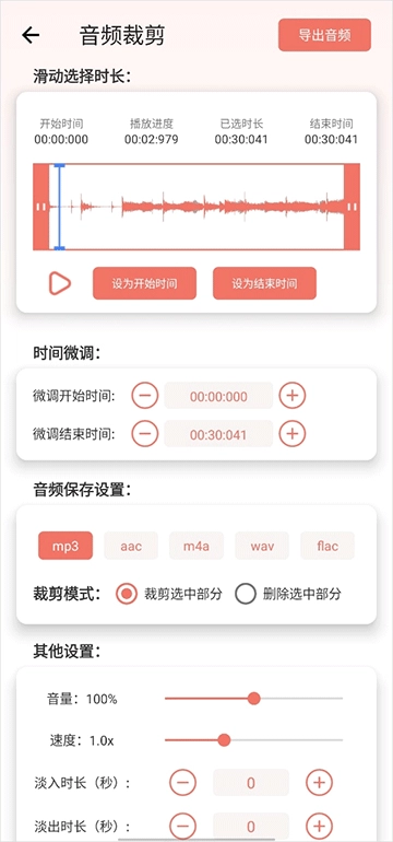 3、在音频裁剪页面我们可以对音频进行简单的处理,处理好了以后,我们点击右上角的“导出音频”将处理过的音频导出