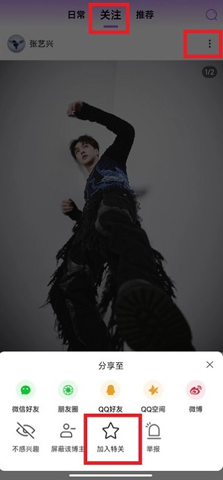 1、在首页的“关注”标签页中,找到目标帖子,点击其右上角的“三个点”图标,接着选择“加入特关”选项即可。