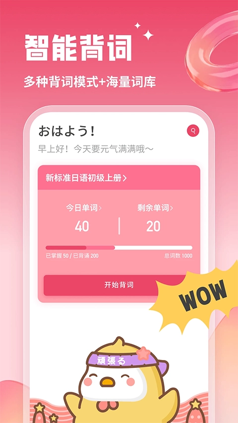 每个学习词语都有标准日语音频教学,标有对应的普通话翻译,罗马音。更好更准地学习日语
