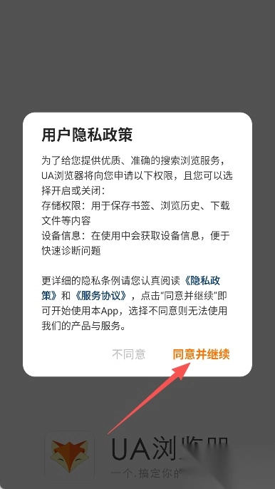 1、在手机上打开UA浏览器应用,并同意对应的用户协议;