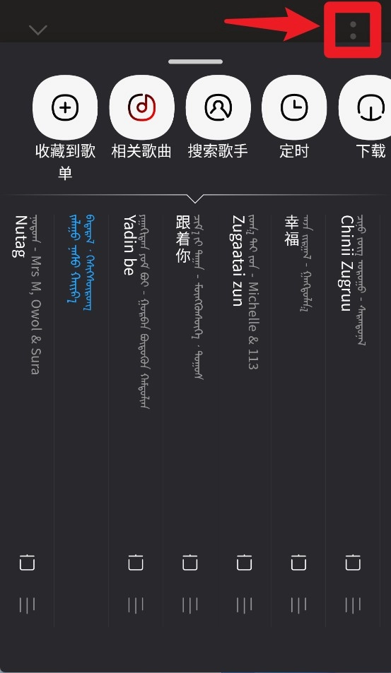 4、点击右上角“更多”按钮可进入播放列表管理,支持收藏、定时、与多首操作