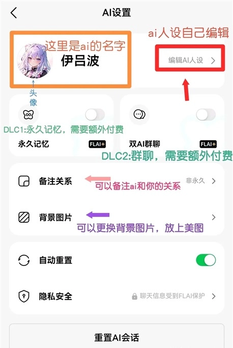 2、自动重置功能是为修改ai设定准备的功能,有时候想要微调ai设定又不舍不得和老公老婆的聊天,只需要关闭该功能就可以调设定而不重置聊天啦