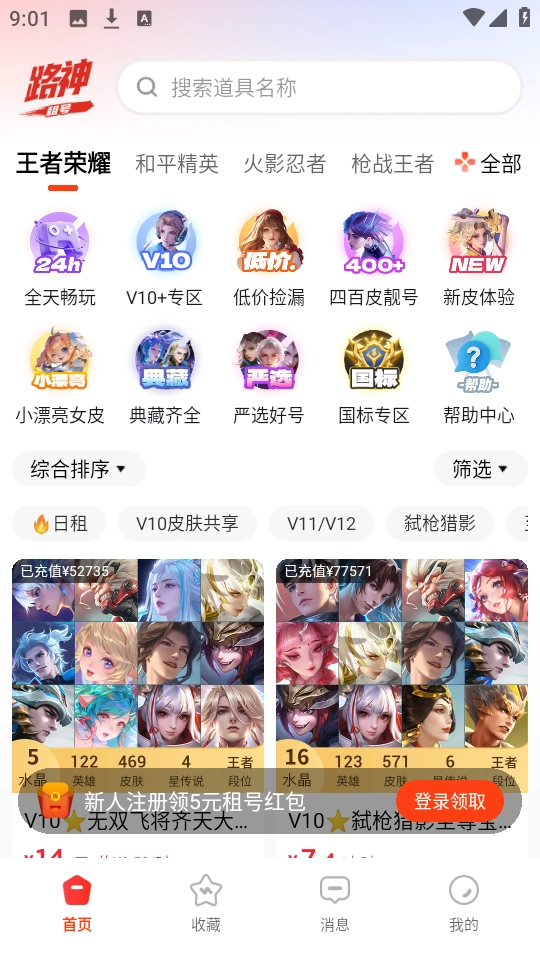 路神租号平台,整合了当下各类热门游戏的海量账号资源。新用户完成注册登录操作后,就能领取租号红包福利。平台支持用户依据价格范围、最低租用时长、游戏段位、英雄皮肤拥有量、英雄类型以及具体道具名称等多样化筛选条件,快速精准地找到符合心意的游戏账号。
